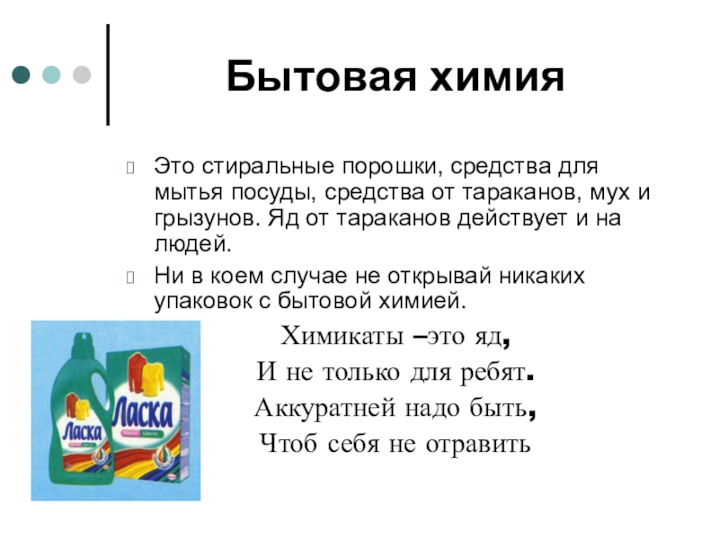 Бытовая химияЭто стиральные порошки, средства для мытья посуды, средства от тараканов, мух и грызунов. Яд от тараканов
