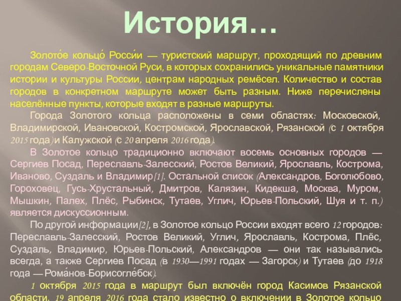 Руси, в которых сохранились уникальные памятники истории и культуры России, центрам народных ремёсел. Количество и состав городов в конкретном маршруте может быть разным. Ниже перечислены населённые пункты, которые входят в разные маршруты.