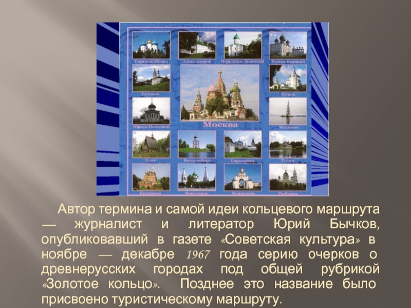 Юрий Бычков, опубликовавший в газете «Советская культура» в ноябре — декабре 1967 года серию очерков о древнерусских городах под общей рубрикой «Золотое кольцо». Позднее это название было присвоено туристическому маршруту.