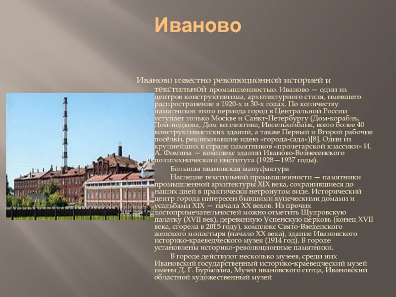 центров конструктивизма, архитектурного стиля, имевшего распространение в 1920-х и 30-х годах. По количеству памятников этого периода город в Центральной России уступает только Москве и Санкт-Петербургу (Дом-корабль, Дом-подкова, Дом коллектива, Ивсельхозбанк, всего более 40 конструктивистских зданий, а также Первый и Второй рабочие посёлки, реализовавшие идею «города-сада»)[8]. Один из крупнейших в стране памятников «пролетарской классики» И. А. Фомина — комплекс зданий Иваново-Вознесенского политехнического института (1928—1937 годы).