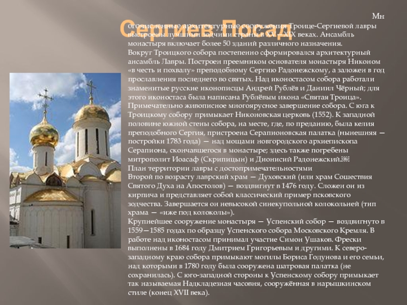 Многочисленные архитектурные сооружения Троице-Сергиевой лавры выстроены лучшими зодчими страны в