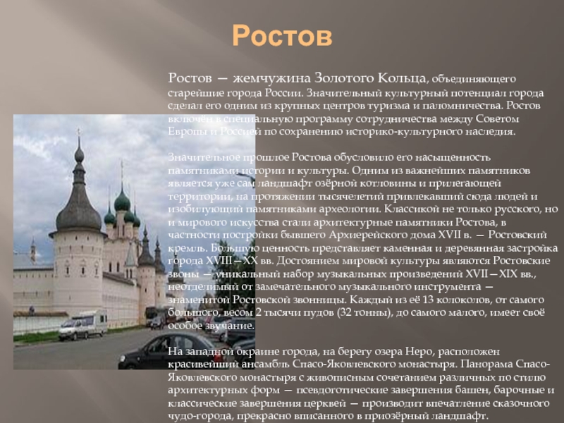 Ростов — жемчужина Золотого Кольца, объединяющего старейшие города России. Значительный культурный