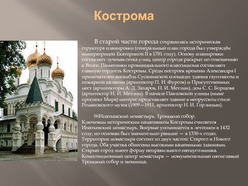 был утверждён императрицей Екатериной II в 1781 году). Основу планировки составляет лучевая сетка улиц, центр города раскрыт по отношению к Волге. Памятники провинциального классицизма составляют главную гордость Костромы. Среди построек времени Александра I примечателен ансамбль Сусанинской площади: здания гауптвахты и пожарной каланчи (архитектор П. И. Фурсов) и Присутственных мест (архитекторы А. Д. Захаров, Н. И. Метлин), дом С. С. Борщова (архитектор Н. И. Метлин). В начале Павловской улицы (ныне проспект Мира) интерес представляет здание в неорусском стиле Романовского музея (1909—1911, архитектор Н. И. Горлицын).