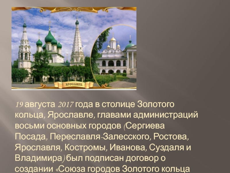 основных городов (Сергиева Посада, Переславля-Залесского, Ростова, Ярославля, Костромы, Иванова, Суздаля и Владимира) был подписан договор о создании «Союза городов Золотого кольца России».