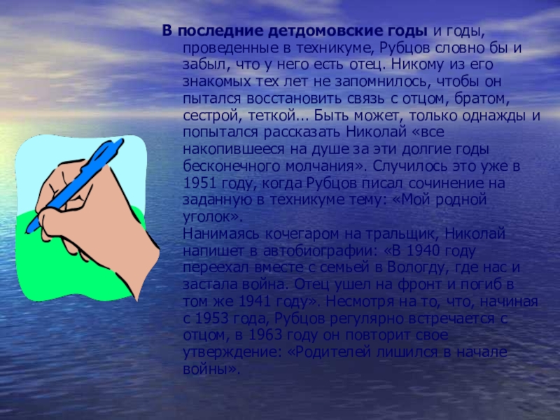 бы и забыл, что у него есть отец. Никому из его знакомых тех лет не запомнилось, чтобы он пытался восстановить связь с отцом, братом, сестрой, теткой... Быть может, только однажды и попытался рассказать Николай «все накопившееся на душе за эти долгие годы бесконечного молчания». Случилось это уже в 1951 году, когда Рубцов писал сочинение на заданную в техникуме тему: «Мой родной уголок».