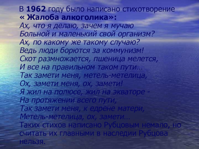 Таких стихов написано Рубцовым немало, но считать их главными в наследии Рубцова нельзя.