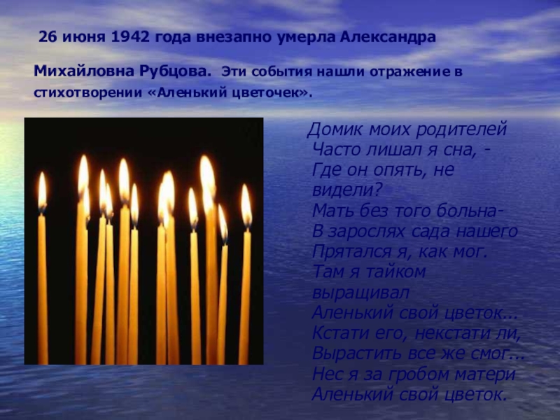 Слайд 4 26 июня 1942 года внезапно умерла Александра Михайловна Рубцова. Эти