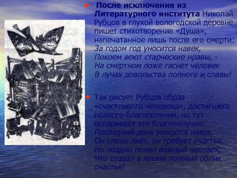Слайд 13 После исключения из Литературного института Николай Рубцов в глухой вологодской