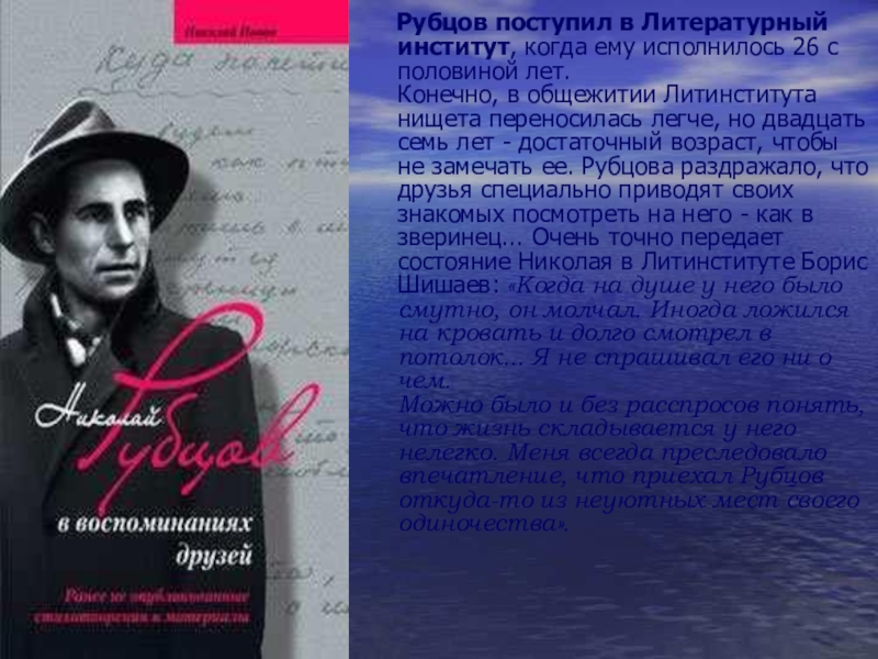 Слайд 12 Рубцов поступил в Литературный институт, когда ему исполнилось 26