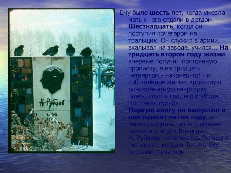 детдом. Шестнадцать, когда он поступил кочегаром на тральщик. Он служил в армии, вкалывал на заводе, учился... На тридцать втором году жизни впервые получил постоянную прописку, а на тридцать четвертом - наконец-то! - и собственное жилье: крохотную однокомнатную квартирку. Здесь, спустя год, его и убили... Вот такая судьба. Первую книгу он выпустил в шестьдесят пятом году, а через двадцать лет его именем назвали улицу в Вологде. Н. Рубцову исполнилось бы всего пятьдесят, когда в Тотьме ему поставят памятник.