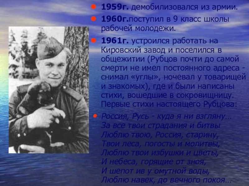 1961г. устроился работать на Кировский завод и поселился в общежитии (Рубцов почти до самой смерти не имел постоянного адреса - снимал «углы», ночевал у товарищей и знакомых), где и были написаны стихи, вошедшие в сокровищницу. Первые стихи настоящего Рубцова: