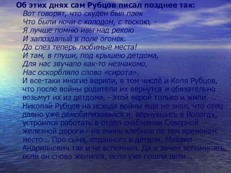 И все-таки многие верили, в том числе и Коля Рубцов, что после войны родители их вернутся и обязательно возьмут их из детдома, - этой верой только и жили. Николай Рубцов на исходе войны еще не знал, что отец давно уже демобилизовался и, вернувшись в Вологду, устроился работать в отдел снабжения Северной железной дороги - на очень хлебное по тем временам место... Про сына, отданного в детдом, Михаил Андриянович так и не вспомнил. Да и зачем вспоминать, если он снова женился, если уже пошли дети...