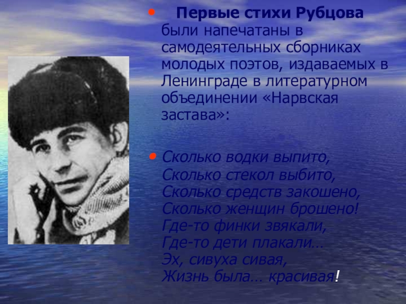 Слайд 10 Первые стихи Рубцова были напечатаны в самодеятельных сборниках молодых