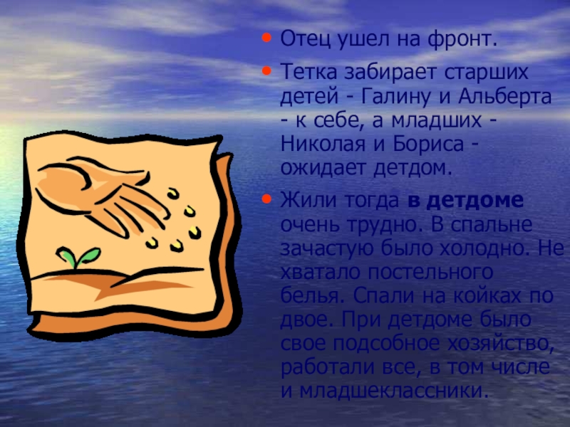 Жили тогда в детдоме очень трудно. В спальне зачастую было холодно. Не хватало постельного белья. Спали на койках по двое. При детдоме было свое подсобное хозяйство, работали все, в том числе и младшеклассники.