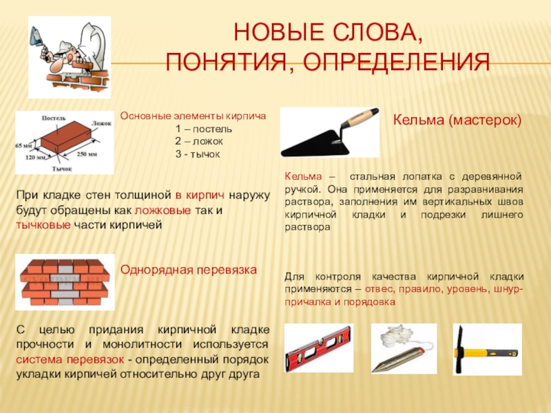 Для контроля качества кирпичной кладки применяются – отвес, правило, уровень, шнур-причалка и порядовка