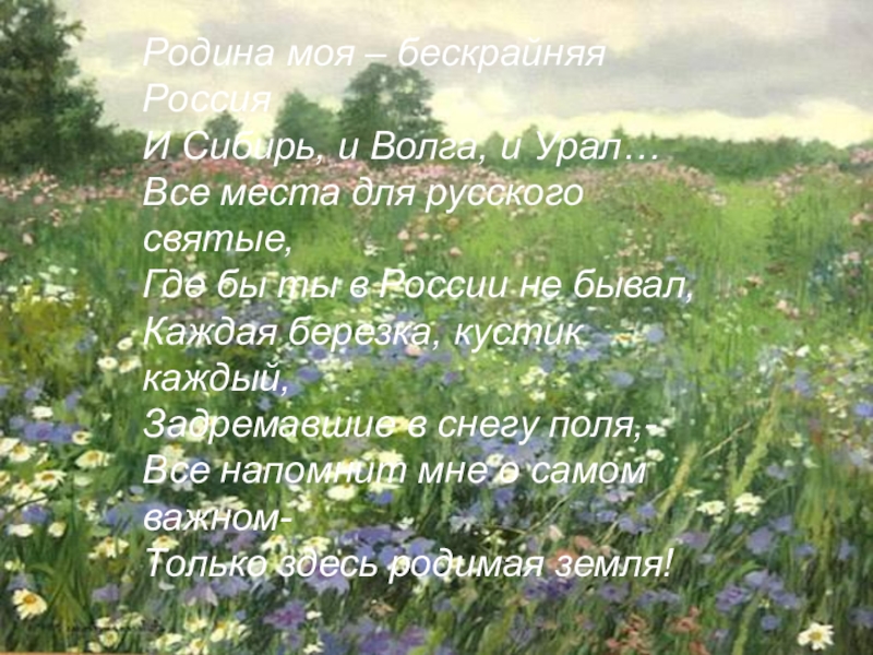 Родина моя – бескрайняя РоссияИ Сибирь, и Волга, и Урал…Все места для русского святые,Где бы ты в