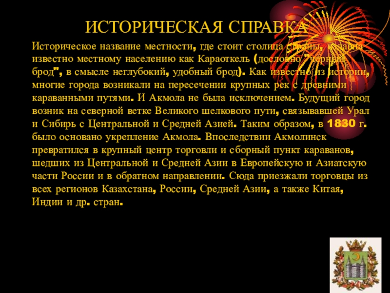 страны, издавна известно местному населению как Караоткель (дословно "черный брод", в смысле неглубокий, удобный брод). Как известно из истории, многие города возникали на пересечении крупных рек с древними караванными путями. И Акмола не была исключением. Будущий город возник на северной ветке Великого шелкового пути, связывавшей Урал и Сибирь с Центральной и Средней Азией. Таким образом, в 1830 г. было основано укрепление Акмола. Впоследствии Акмолинск превратился в крупный центр торговли и сборный пункт караванов, шедших из Центральной и Средней Азии в Европейскую и Азиатскую части России и в обратном направлении. Сюда приезжали торговцы из всех регионов Казахстана, России, Средней Азии, а также Китая, Индии и др. стран.