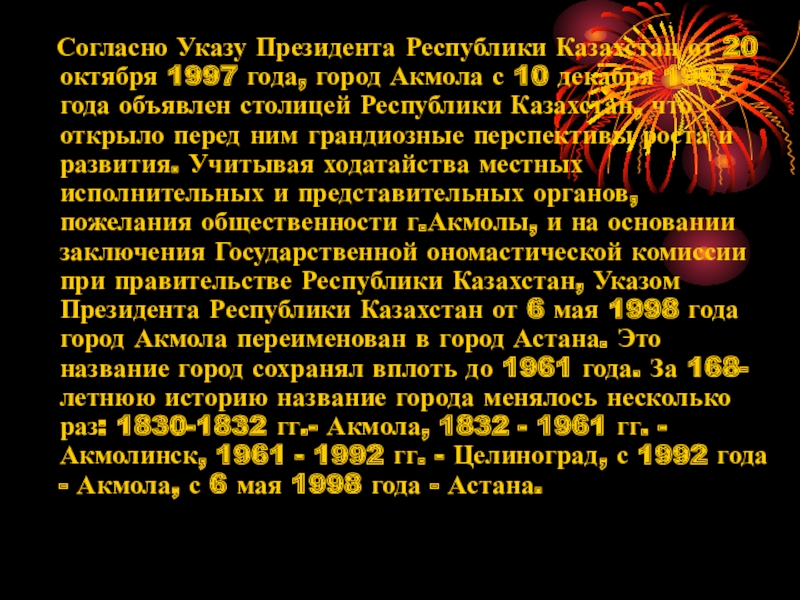 года, город Акмола с 10 декабря 1997 года объявлен столицей Республики Казахстан, что открыло перед ним грандиозные перспективы роста и развития. Учитывая ходатайства местных исполнительных и представительных органов, пожелания общественности г.Акмолы, и на основании заключения Государственной ономастической комиссии при правительстве Республики Казахстан, Указом Президента Республики Казахстан от 6 мая 1998 года город Акмола переименован в город Астана. Это название город сохранял вплоть до 1961 года. За 168-летнюю историю название города менялось несколько раз: 1830-1832 гг.- Акмола, 1832 - 1961 гг. - Акмолинск, 1961 - 1992 гг. - Целиноград, с 1992 года - Акмола, с 6 мая 1998 года - Астана.