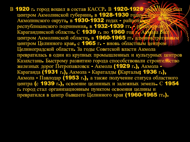 Слайд 5В 1920 г. город вошел в состав КАССР. В 1920-1928 годах