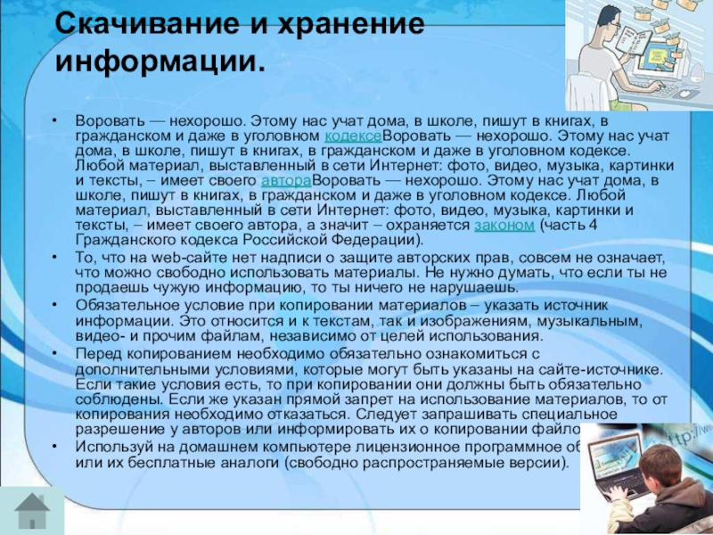 книгах, в гражданском и даже в уголовном кодексеВоровать — нехорошо. Этому нас учат дома, в школе, пишут в книгах, в гражданском и даже в уголовном кодексе. Любой материал, выставленный в сети Интернет: фото, видео, музыка, картинки и тексты, – имеет своего автораВоровать — нехорошо. Этому нас учат дома, в школе, пишут в книгах, в гражданском и даже в уголовном кодексе. Любой материал, выставленный в сети Интернет: фото, видео, музыка, картинки и тексты, – имеет своего автора, а значит – охраняется законом (часть 4 Гражданского кодекса Российской Федерации).