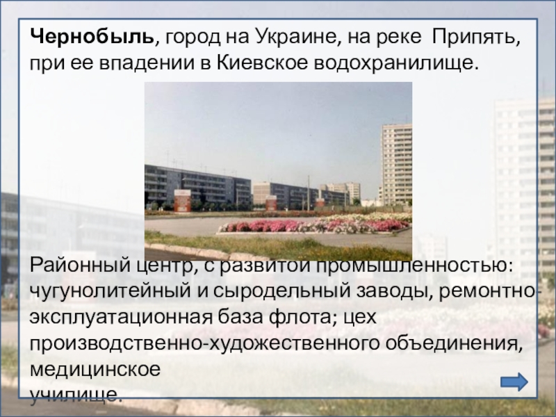 Чернобыль, город на Украине, на реке Припять, при ее впадении в Киевское водохранилище.