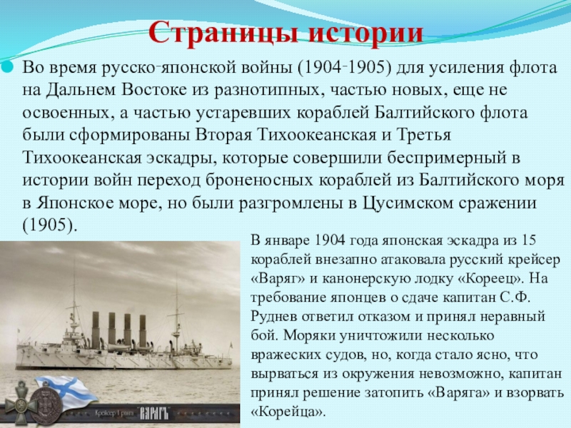 В январе 1904 года японская эскадра из 15 кораблей внезапно атаковала русский крейсер «Варяг» и канонерскую лодку «Кореец». На требование японцев о сдаче капитан С.Ф. Руднев ответил отказом и принял неравный бой. Моряки уничтожили несколько вражеских судов, но, когда стало ясно, что вырваться из окружения невозможно, капитан принял решение затопить «Варяга» и взорвать «Корейца».