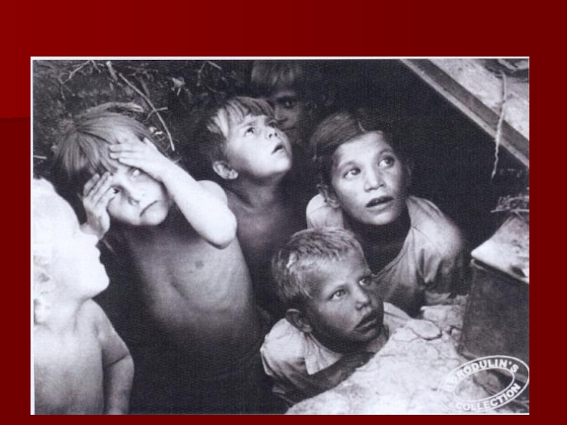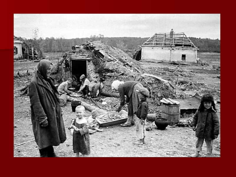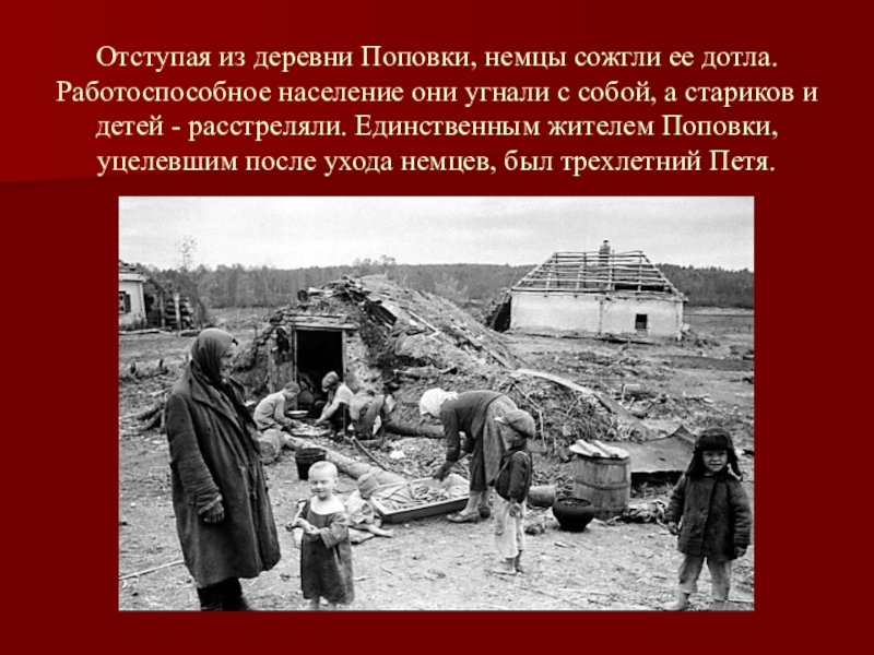 Слайд 4Отступая из деревни Поповки, немцы сожгли ее дотла. Работоспособное население они