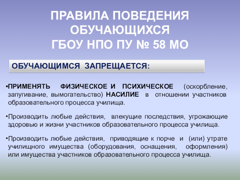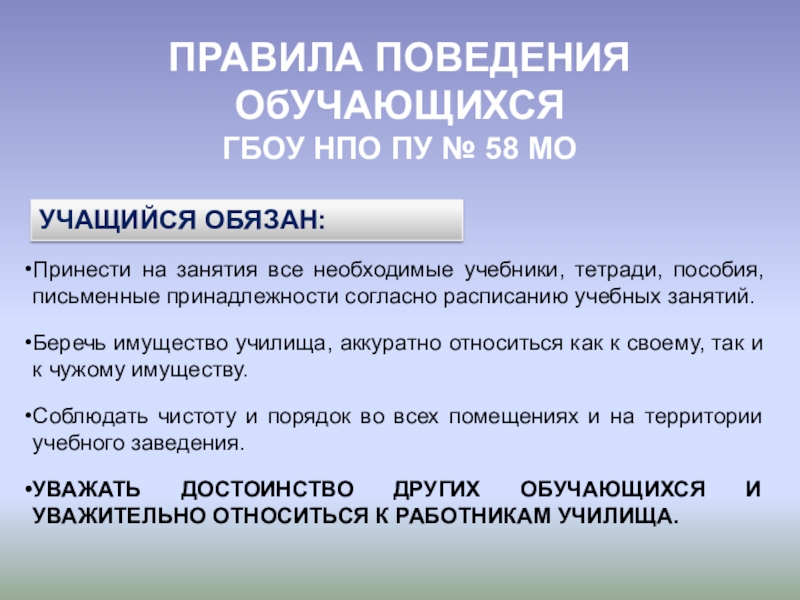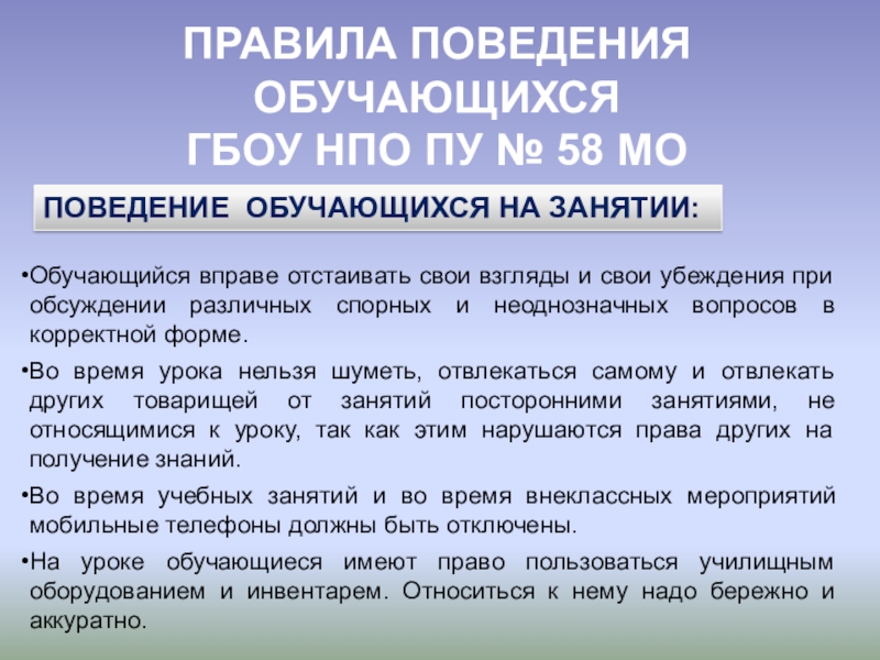 Слайд 19ПРАВИЛА ПОВЕДЕНИЯ ОбУЧАЮЩИХСЯ