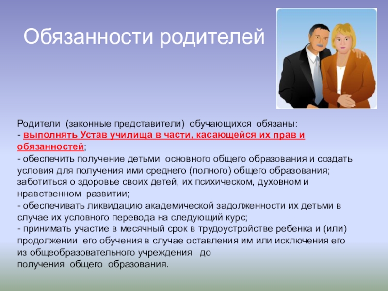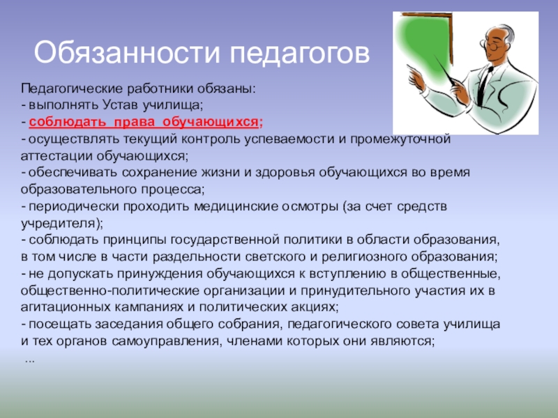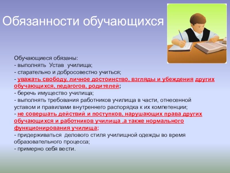 - выполнять требования работников училища в части, отнесенной уставом и правилами внутреннего распорядка к их компетенции;
