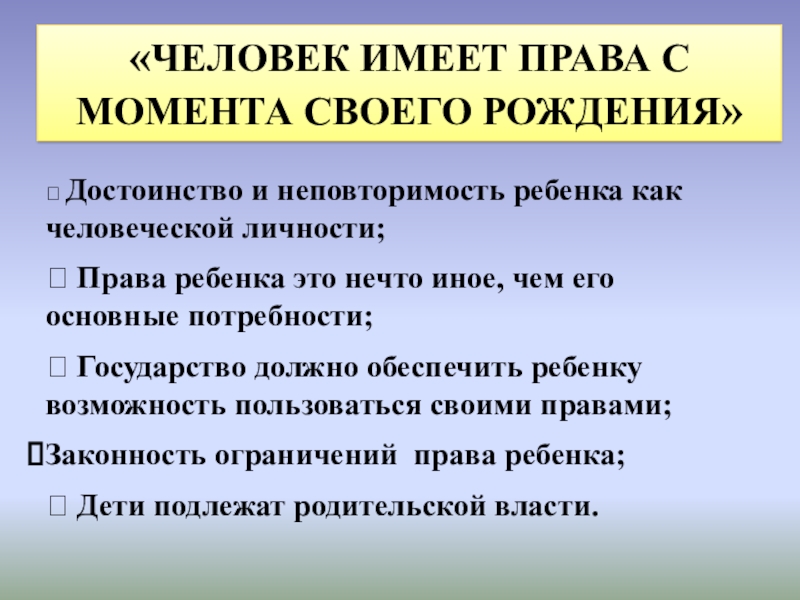 «ЧЕЛОВЕК ИМЕЕТ ПРАВА С МОМЕНТА СВОЕГО РОЖДЕНИЯ»