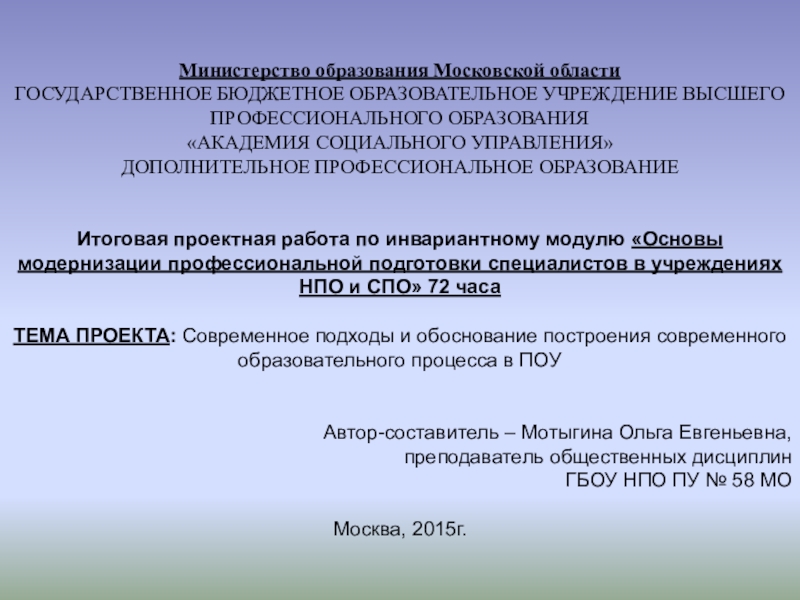 Итоговая проектная работа по инвариантному модулю «Основы модернизации профессиональной подготовки специалистов в учреждениях НПО и СПО» 72 часа