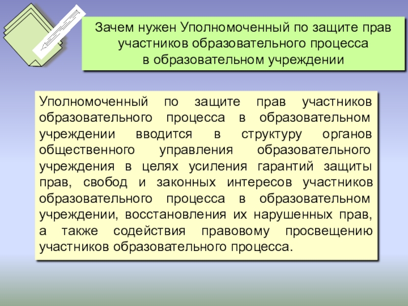 Слайд 24Уполномоченный по защите прав участников образовательного процесса в образовательном учреждении вводится