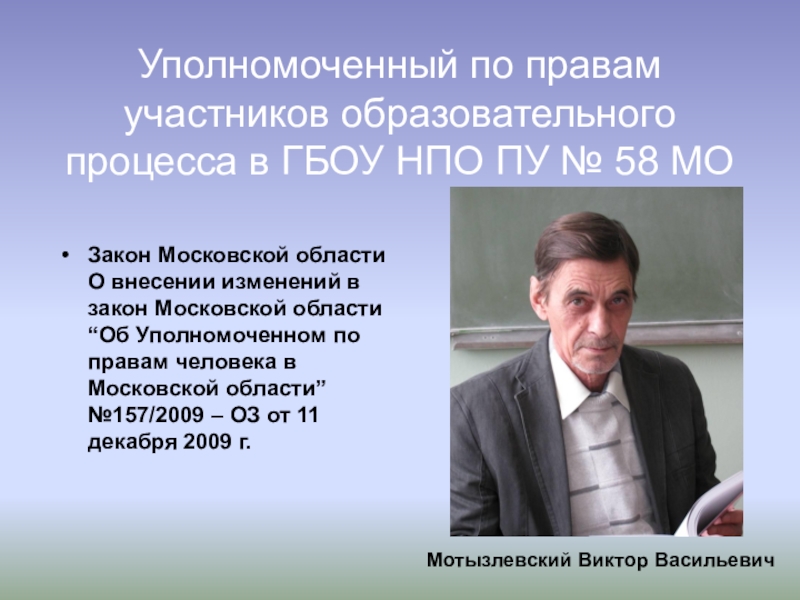 преподаватель истории, права и обществознания, уполномоченный по правам участников образовательного процесса в ГБОУ НПО ПУ № 58 МО