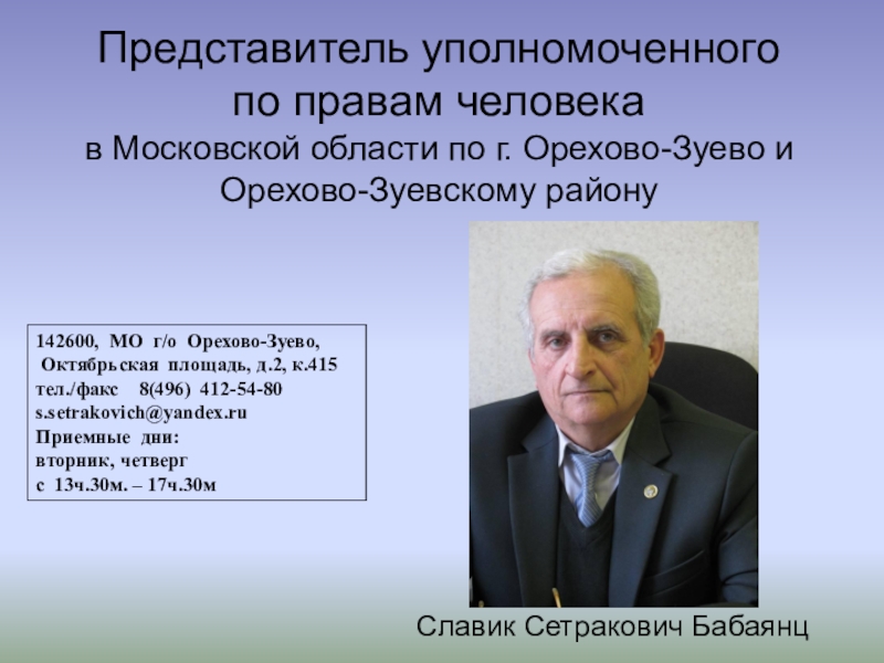 - представитель уполномоченного по правам человека в Московской области по г. Орехово-Зуево и Орехово-Зуевскому району Славик Сетракович Бабаянц ,