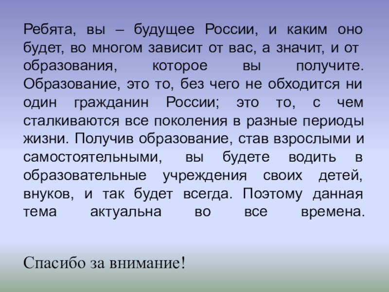 зависит от вас, а значит, и от образования, которое вы получите. Образование, это то, без чего не обходится ни один гражданин России; это то, с чем сталкиваются все поколения в разные периоды жизни. Получив образование, став взрослыми и самостоятельными, вы будете водить в образовательные учреждения своих детей, внуков, и так будет всегда. Поэтому данная тема актуальна во все времена.
