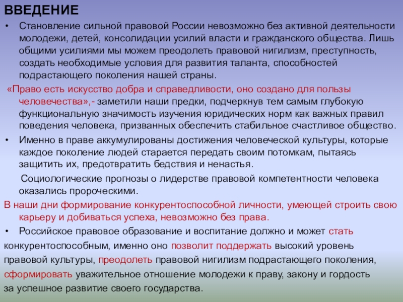 правовой культуры, преодолеть правовой нигилизм подрастающего поколения,