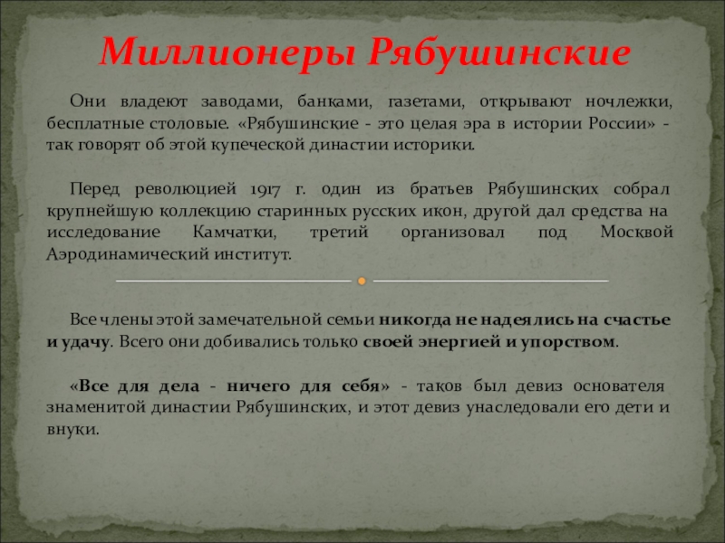 У староверов формировались необходимые для бизнеса качества – внутренняя дисциплина, способность к максимальной концентрации волевых усилий, стремление к независимости. Им было не до развлечений, не до танцев, не до табака и водки. Выживали самые крепкие, привыкшие зарабатывать и рассчитывать только на себя. И эти качества как нельзя более подходили для первого этапа развития российского капитализма». А потом в бизнес пришли их дети – третье поколение российских купцов и предпринимателей. Именно это поколение начинает тратить свои заработанные деньги на общественные нужды, на развитие в стране высокой культуры.