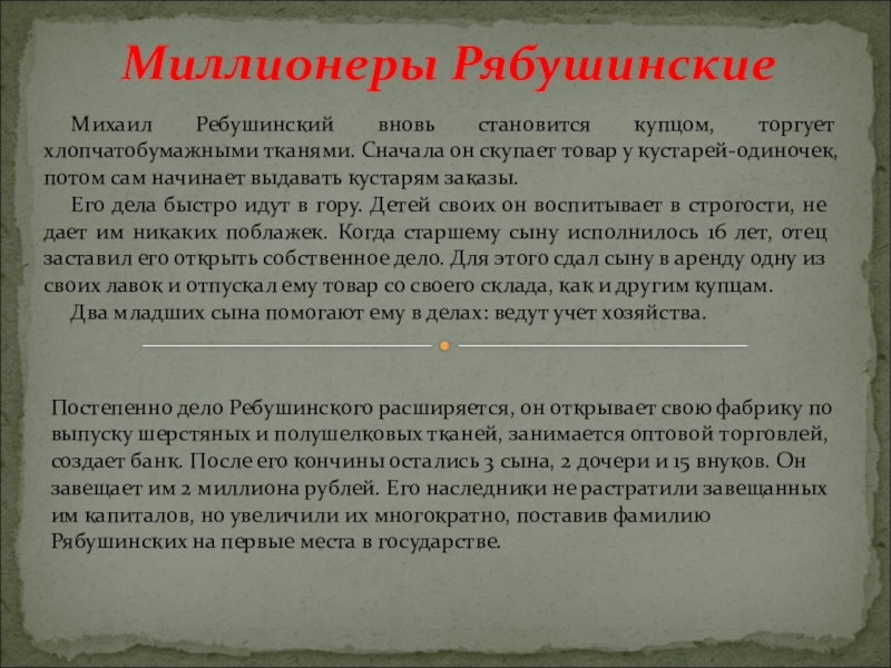 Постепенно дело Ребушинского расширяется, он открывает свою фабрику по выпуску шерстяных и полушелковых тканей, занимается оптовой торговлей, создает банк. После его кончины остались 3 сына, 2 дочери и 15 внуков. Он завещает им 2 миллиона рублей. Его наследники не растратили завещанных им капиталов, но увеличили их многократно, поставив фамилию Рябушинских на первые места в государстве.