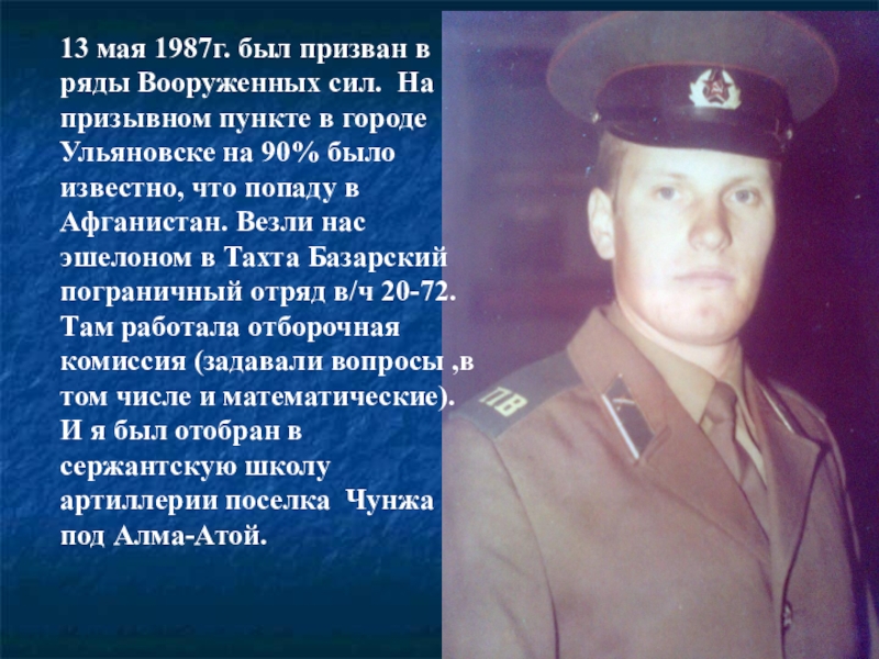 13 мая 1987г. был призван в ряды Вооруженных сил. На призывном пункте в городе Ульяновске на 90%