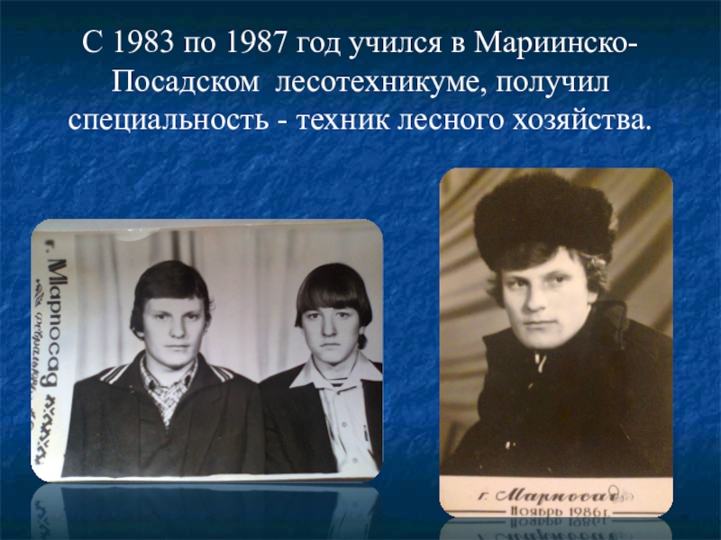 С 1983 по 1987 год учился в Мариинско- Посадском лесотехникуме, получил специальность - техник