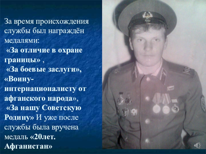 границы» , «За боевые заслуги», «Воину-интернационалисту от афганского народа», «За нашу Советскую Родину» И уже после службы была вручена медаль «20лет. Афганистан»