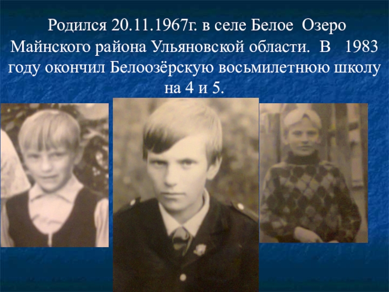 района Ульяновской области. В 1983 году окончил Белоозёрскую восьмилетнюю школу на 4 и 5.