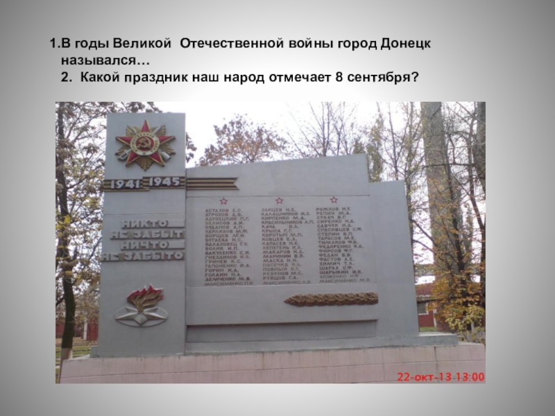 Слайд 27В годы Великой Отечественной войны город Донецк назывался…