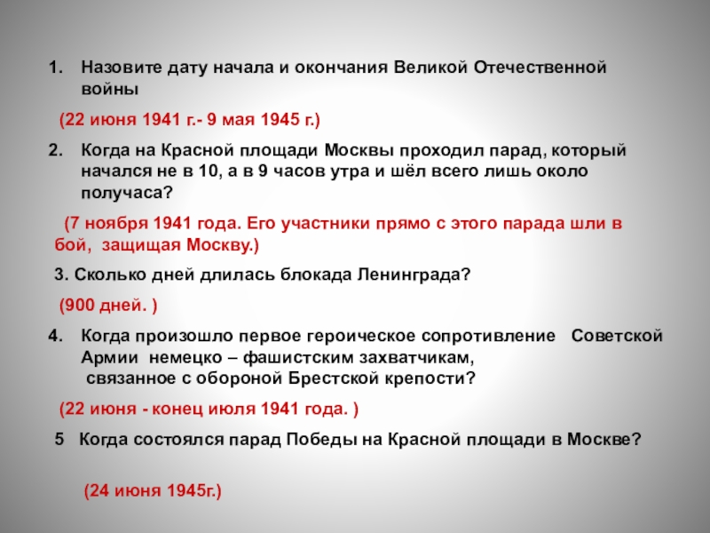 Слайд 6Назовите дату начала и окончания Великой Отечественной войны