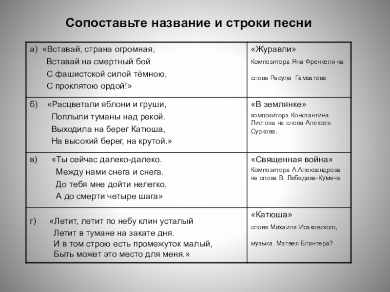 Слайд 25Сопоставьте название и строки песни