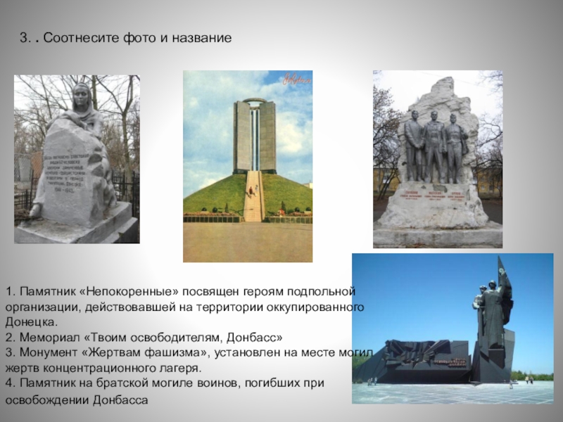 1. Памятник «Непокоренные» посвящен героям подпольной