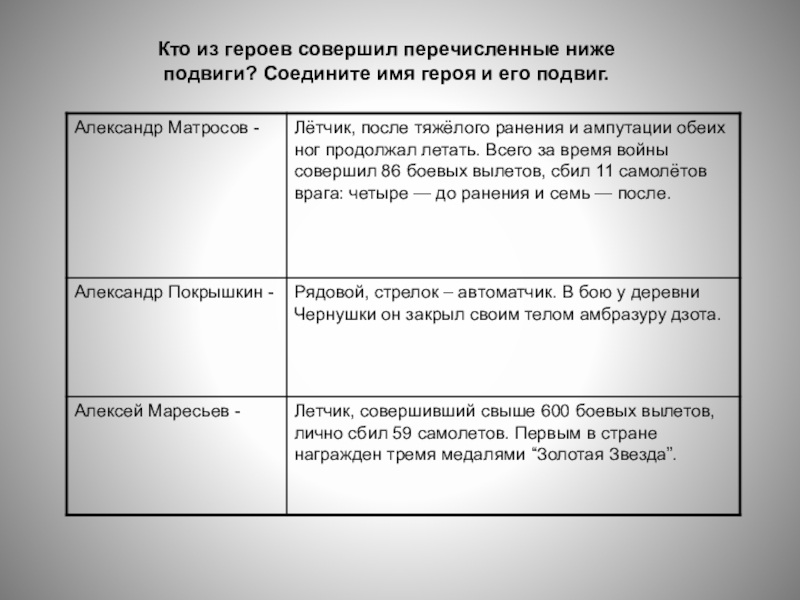 Слайд 14Кто из героев совершил перечисленные ниже подвиги? Соедините имя героя и