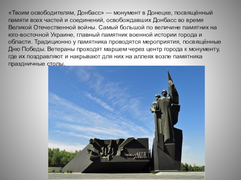Слайд 32«Твоим освободителям, Донбасс» — монумент в Донецке, посвящённый памяти всех частей