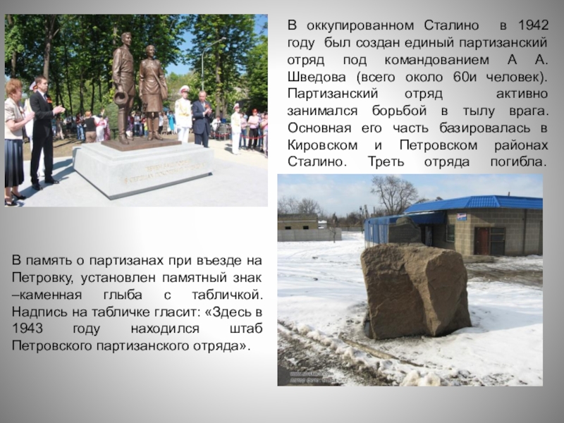 В оккупированном Сталино в 1942 году был создан единый партизанский отряд под командованием А А. Шведова (всего около 60и человек). Партизанский отряд активно занимался борьбой в тылу врага. Основная его часть базировалась в Кировском и Петровском районах Сталино. Треть отряда погибла.