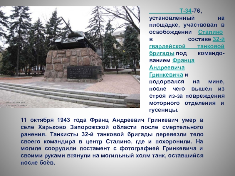 установленный на площадке, участвовал в освобождении Сталино в составе 32-й гвардейской